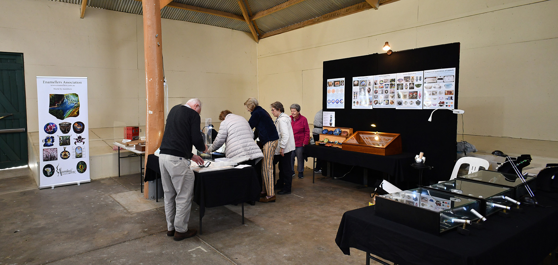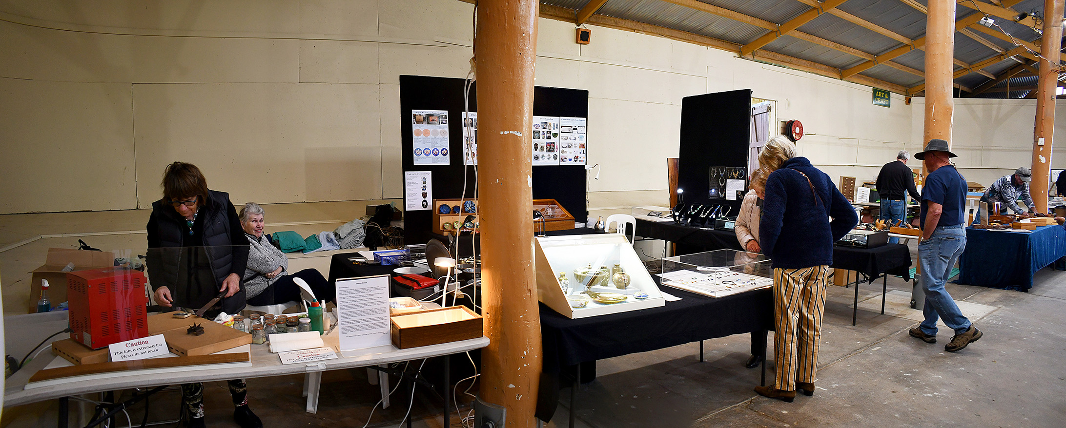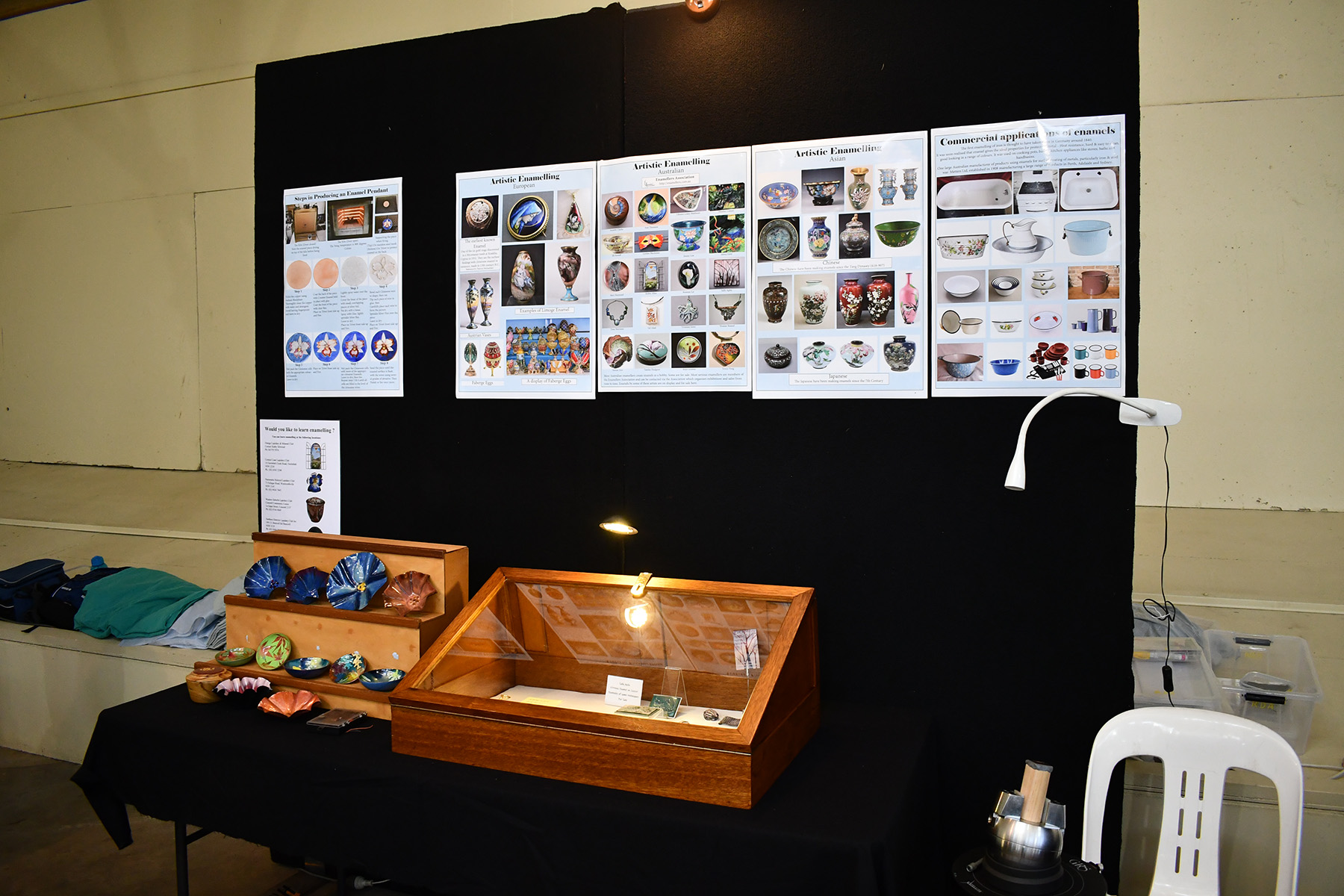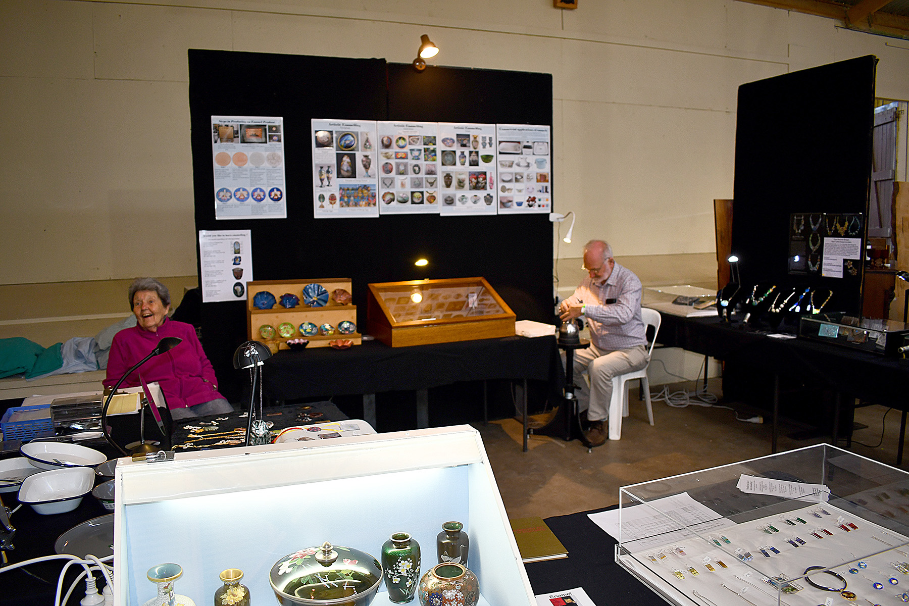 This is the second year that the Enamellers Association has participated in the Bathurst Heritage Trades Trail. This is a large fair that promotes old arts and crafts. It is held over a weekend in April at the Showground. This year over 3,000 people attended and the Association’s stall created a great deal of interest. Our attending members demonstrated many of the skills involved in enamelling and related activities. Our members saw many different traditional crafts expertly executed.