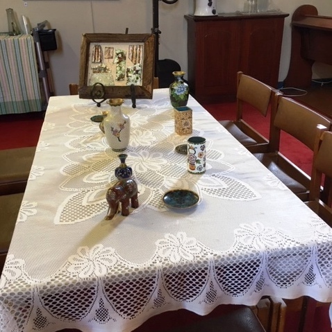 4 tables were set up in the historic Christ Church. The priest encourages all art forms to be displayed, or if musical, performed, in the church. One table had examples of traditional enamelling you would purchase when travelling. One table had many of the tools and examples of enamel powder; so that the techniques involved could be explained to visitors.